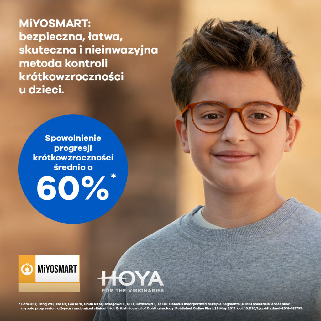 Okulary z soczewkami MiYOSMART to bezpieczna, komfortowa i nieinwazyjna metoda spowalniania rozwoju krótkowzroczności u dzieci. Wykorzystują innowacyjną Technologię D.I.M.S. (Defocus Incorporated Multiple Segments), której działanie zostało potwierdzone wieloletnimi badaniami klinicznymi.